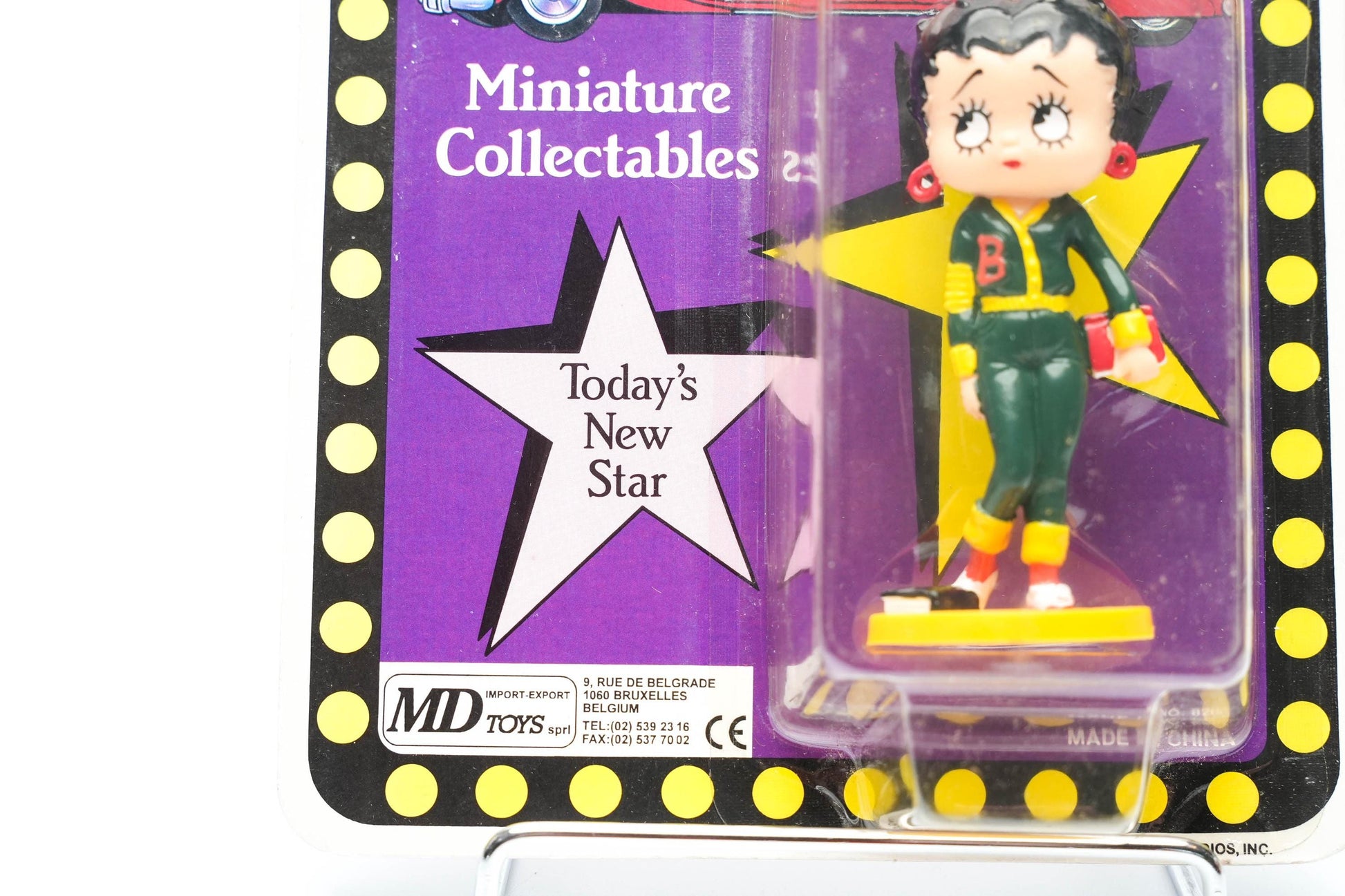 Een must-have voor echte Betty Boop-verzamelaars! Dit originele miniatuurfiguur uit 1986 is een officiële uitgave van King Features Syndicate & Fleischer Studios, geproduceerd door MD Toys. Betty Boop is in deze unieke uitvoering te zien in een sportieve varsity outfit, compleet met een donkergroene sportjack, bijpassende broek en een bijbel als accessoire.