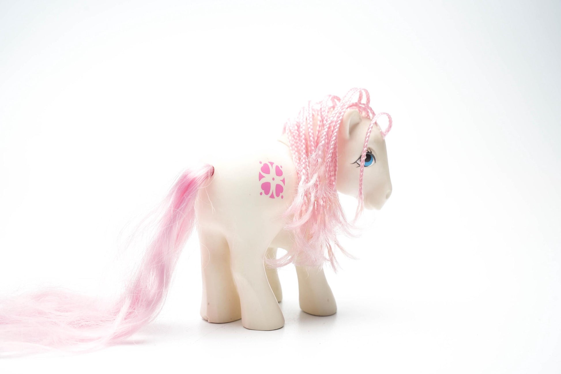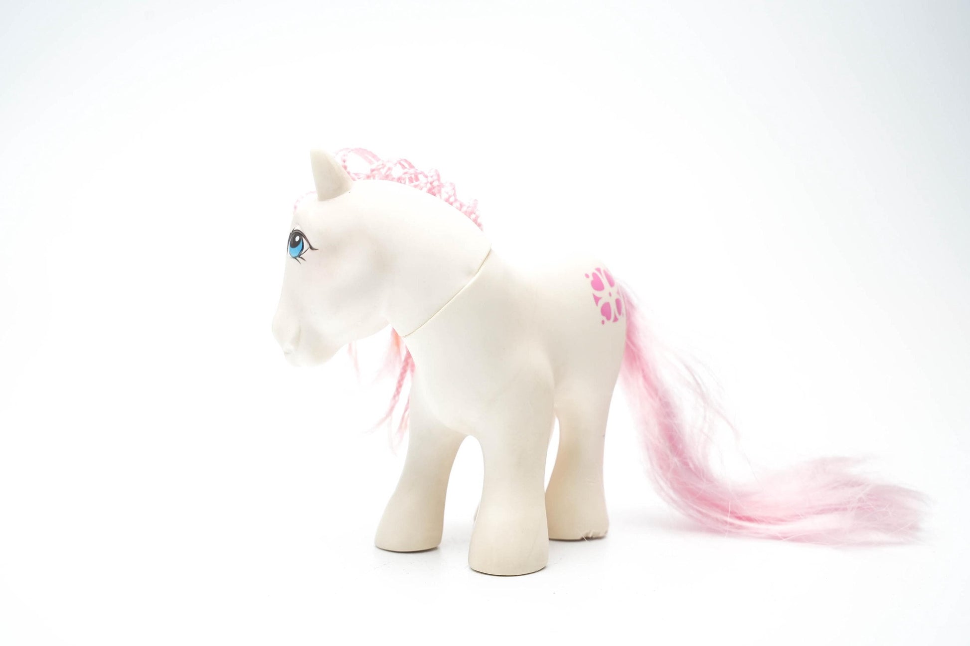Breng een stukje jaren '80 magie in huis met de originele My Little Pony G1 Sundance! Deze vintage pony, uitgebracht door Hasbro in 1983, is een iconisch verzamelobject dat zowel nostalgie als charme uitstraalt. Met haar crèmekleurige lijfje, pastelroze manen en hartvormige bloemenpatroon is Sundance een must-have voor elke ponyliefhebber en verzamelaar.