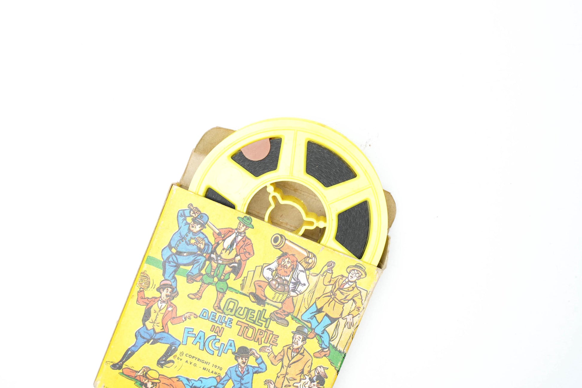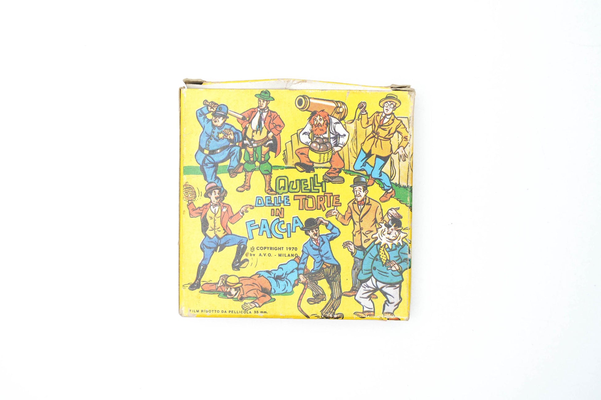 De kleurrijke verpakking, getiteld Quelli delle torte in faccia, is een feest voor het oog en toont een bonte verzameling klassieke komieken uit de stomme film–tijd. Dit is een absolute must-have voor liefhebbers van retro cinema en vintage projectiemateriaal.