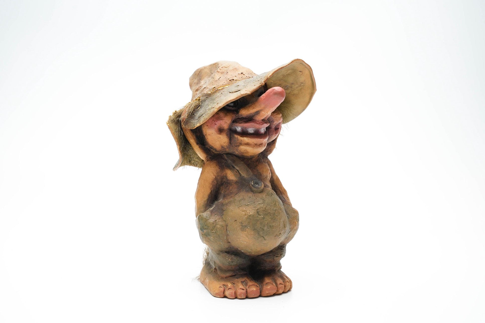 Breng een vleugje Scandinavische charme in je huis met de Vintage Nyform Trol met Hoed. Dit handgemaakte Noorse trollenbeeldje van 15 cm (ca. 5.9 inch) is niet alleen een decoratief accent, maar ook een stukje folklore dat je gegarandeerd aan het lachen maakt. Met zijn grote flaphoed en vrolijke uitstraling is dit beeldje een perfecte aanvulling voor elke verzameling of als uniek cadeau.